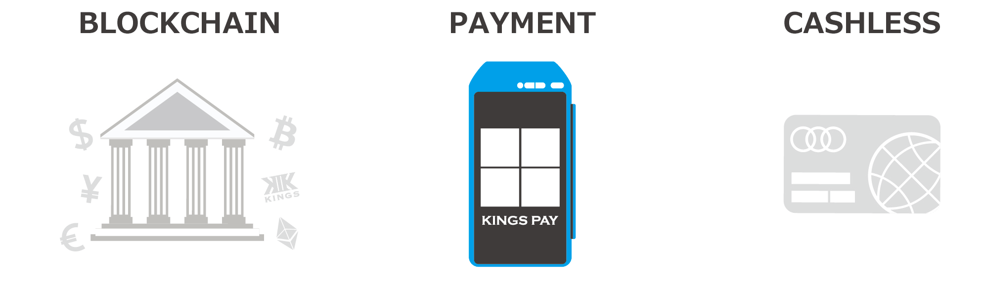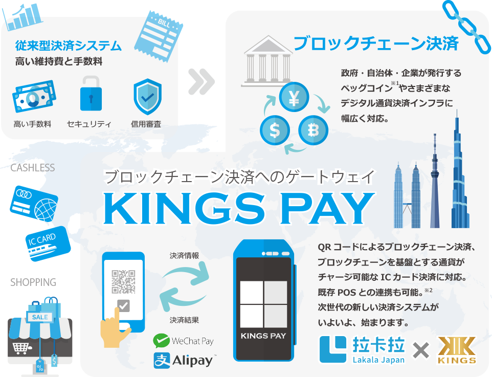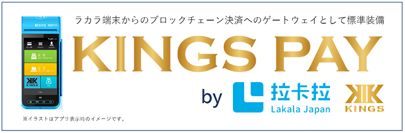 KINGSは、決済取引高65兆円の世界最大規模スマート決済POS端末企業の日本法人、 株式会社ラカラ・ジャパンと「ブロックチェーン決済対応端末」を共同開発し、 次世代の決済ゲートウェイとして、 市場に流通しているさまざまなブロックチェーン決済を可能にします。 Lakara 端末を利用したKINGS PAYの決済ゲートウェイシステムの仕組み